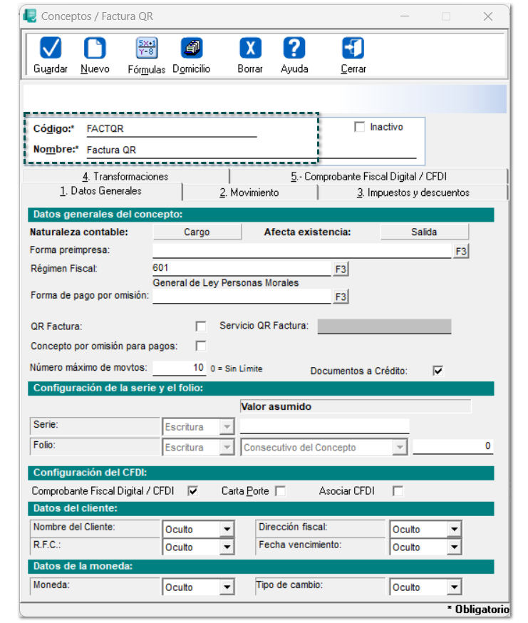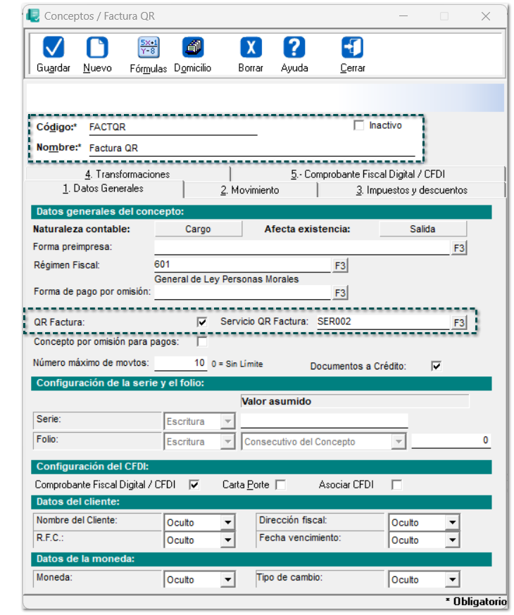 Al crear el concepto, deberás marcar la casilla QR Factura dentro del concepto, la cual te permitirá configurar el servicio por default que tomará para la creación de las facturas.