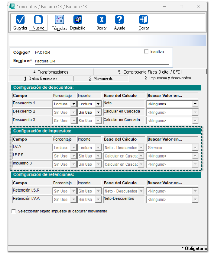 Dentro del concepto, al activar la casilla de QR Factura te asignará el impuesto para que sea tomado desde el servicio.
