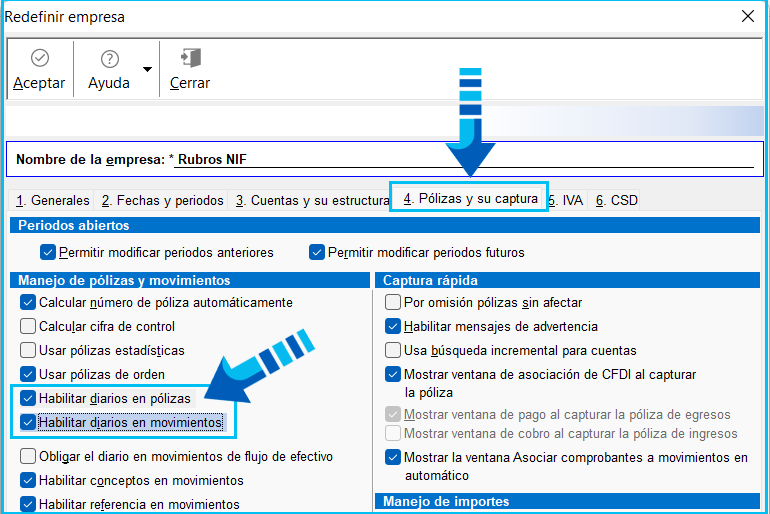 Recuerda que para asignar diarios en tus pólizas y movimientos debes tener dichas opciones habilitadas en la redefinición de la empresa, por lo que debes asegurarte que en el menú Configuración, opción "Redefinir empresa <Ctrl>+<R>, dentro de la pestaña "4.Pólizas y su captura" se encuentren habilitadas:
