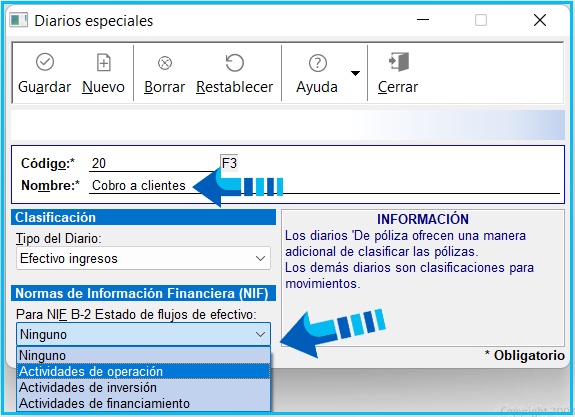 En el diario especial se asigna el tipo de actividad o la Norma de Información Financiera que te va a ayudar a clasificar como tal si es de operación, inversión o financiamiento; por lo que es muy importante que se haga esa clasificación, ya que de acuerdo a eso se calculan los importes en el reporte. Sin embargo tú puedes decidir si modificar o no los nombres de tus diarios especiales dependiendo de si los estás utilizando o no para algo más.