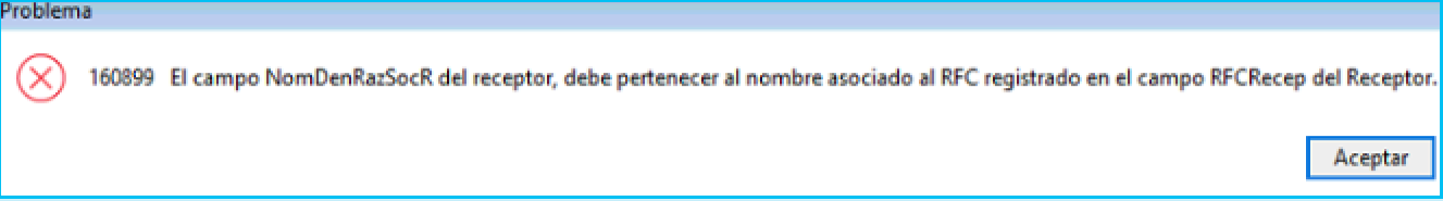 En versiones anteriores del sistema, en algunos casos no era posible capturar el nombre completo del receptor y cuando este era muy largo se presentaba el siguiente mensaje al tratar de timbrar las retenciones: