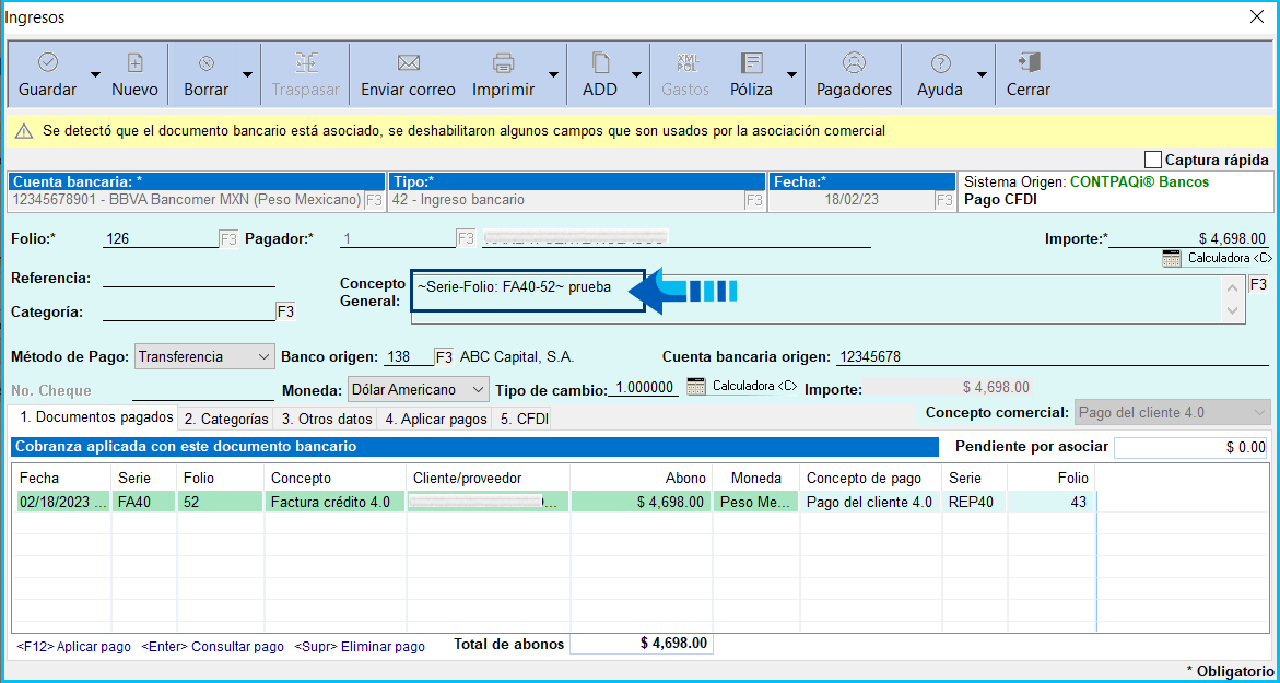 En versiones anteriores del sistema, no se mostraban los folios de los XML asociados al documento bancario, en el concepto general al consultar el documento en CONTPAQi®Bancos, después de asociarle los XML de las facturas creadas en CONTPAQi® Comercial Premium y aplicar los pagos.