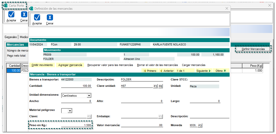 En esta versión, se visualizará correctamente la información que se capture desde el campo Peso en KG en la "Plantilla de Formato Digital" utilizada al momento de estar capturando un documento de tipo ingreso con complemento Carta Porte 3.0.