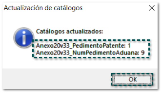 Al finalizar mostrará la ventana de Actualización de catálogos, indicando el total de registros actualizados.