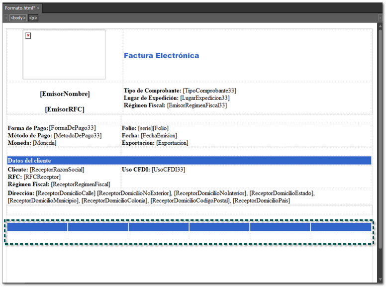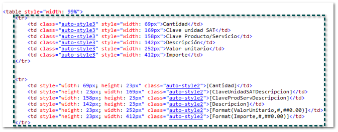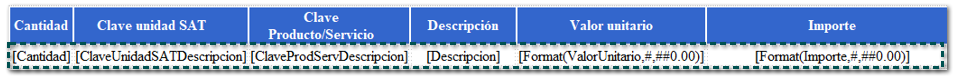 Agrega el texto fijo que tendrá cada columna. Ej: Cantidad, Clave unidad SAT, Clave Producto/Servicio, Descripción, Valor unitario e Importe.