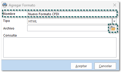 Se mostrará la siguiente ventana, captura un Nombre al formato, posteriormente haz clic en el icono de la carpeta.