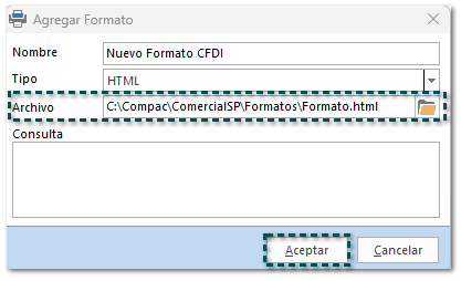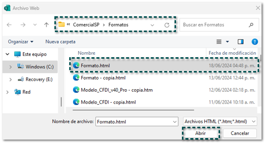 En la ventana del explorador de Windows, ve a la ruta: C:\Compac\ComercialSP\Formatos.
