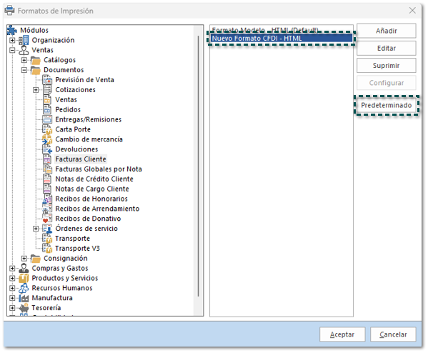 Elige el Formato configurado y haz clic en el botón Predeterminar, para asignar el formato por default al tipo de documento; lo que indica que es el formato en el que se generará el PDF al realizar el timbrado del documento, así com al visualizar la vista previa.