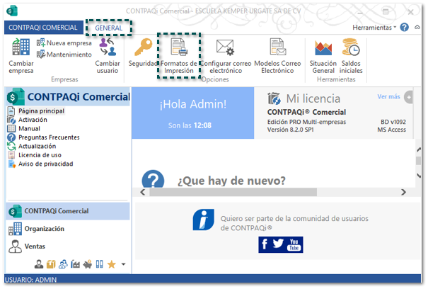 Dentro del sistema CONTPAQi Comercial Start-Pro, ve a la pestaña GENERAL y haz clic en Formatos de Impresión.