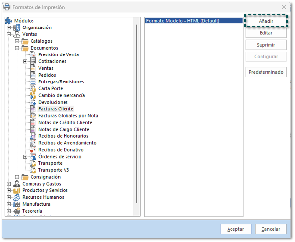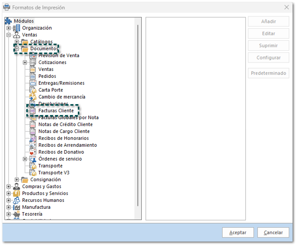 Una vez configurados los formatos para Facturas Cliente, haz clic en el botón Aceptar.