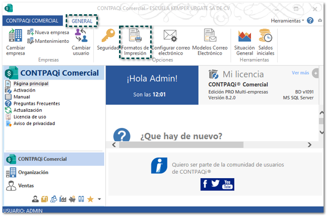 Dentro del sistema ve a la pestaña GENERAL y haz clic en Formatos de Impresión.