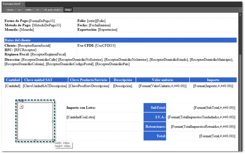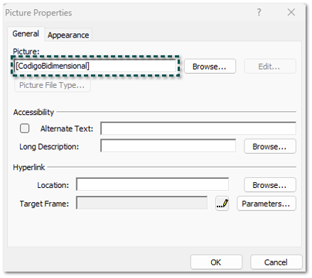 En este ejemplo se agrega la etiqueta [CodigoBidimensional], dentro de las propiedades de la imagen, en el campo Picture.