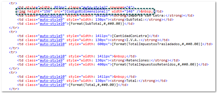 Dentro del código html registra la etiqueta: <td><img src="[CodigoBidimensional]" /> </td>