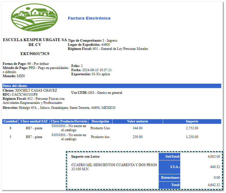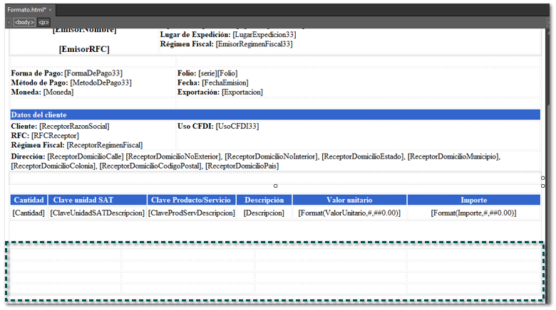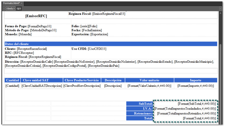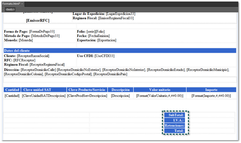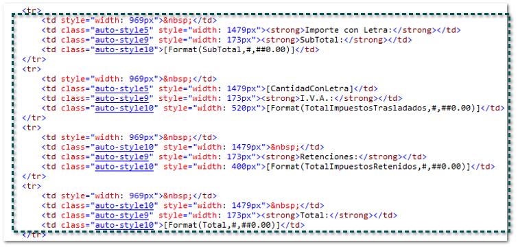 Ahora veremos el pie de página, en el cual se incluyen los totales del documento: