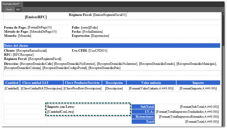 Finalmente en la primera fila de la columna capturamos el texto fijo para el importe con letra, y en la siguiente fila la etiqueta que le corresponde.