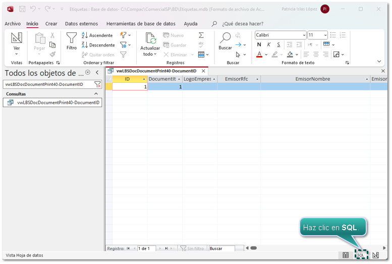 Al visualizar los resultados de la consulta haz clic en la opción SQL que se encuentra en la parte inferior derecha de la ventana de Access®.