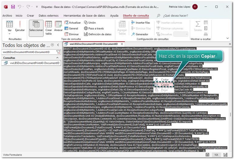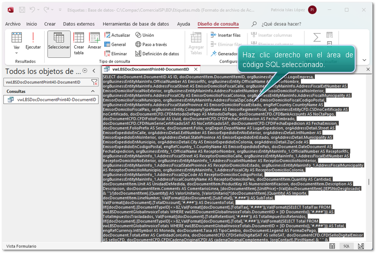 Esto te enviara a la vista en SQL donde el código se encuentra seleccionado; para copiar el texto de la consulta haz clic derecho.