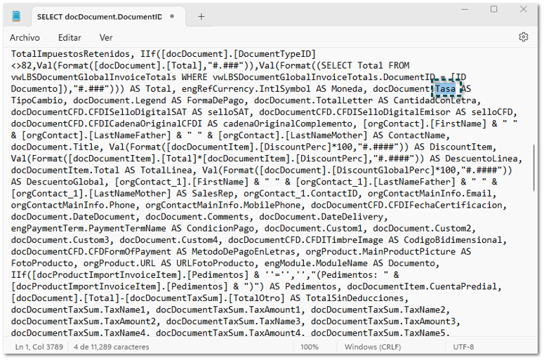 Una vez localizada la palabra Tasa, cambia el texto por Rate (Ejemplo: docDocument.Rate).