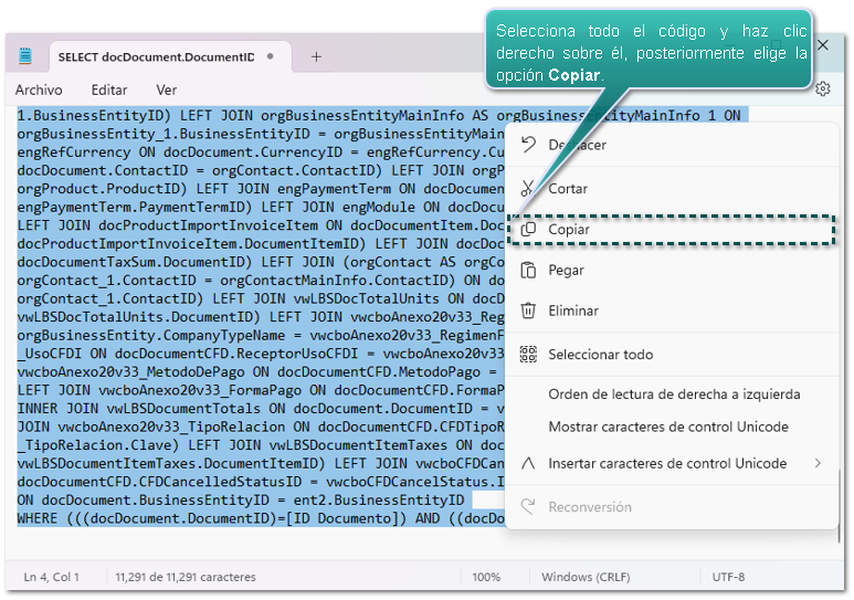 Una vez cambiada la palabra Tasa a Rate y/o Moneda por Currency; selecciona todo el texto del Bloc de notas, haz clic derecho y elige la opción Copiar.