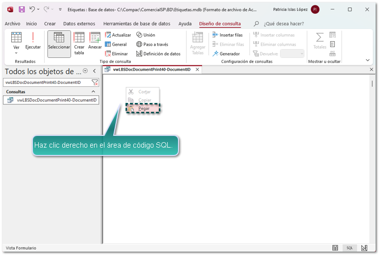 En la consulta de Access® borra la consulta original, posteriormente haz clic derecho y elige la opción Pegar.