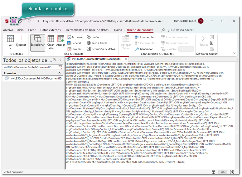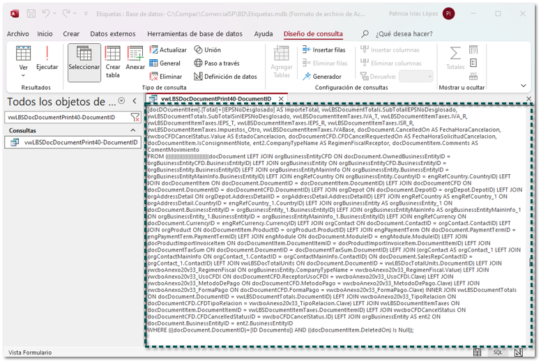 Abre la base de datos de tu empresa en Access®, busca la consulta vwLBSDocDocumentPrint40-DocumentID y haz doble clic sobre ella.