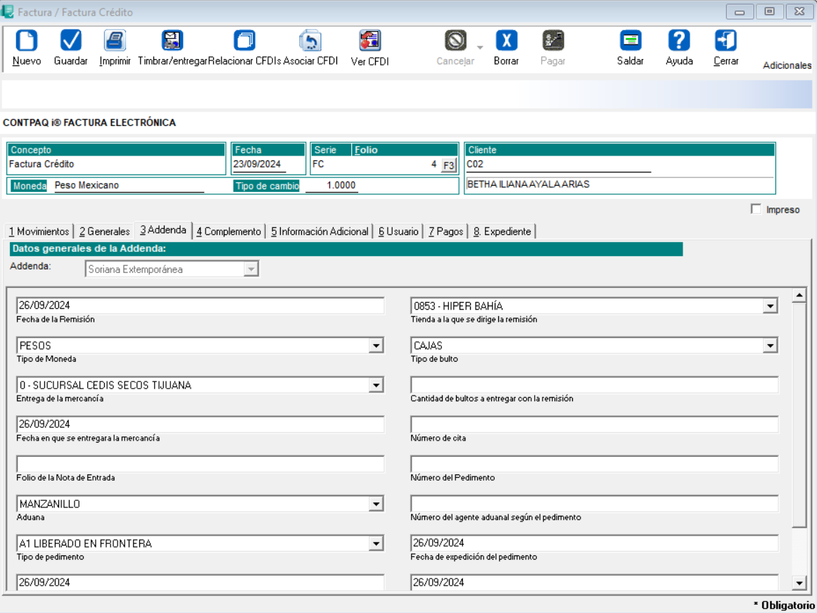 En esta versión, se añaden las sucursales: 700 - CABECERA GARCIA, 581 - RÍO PESQUERÍA, 0853 - HIPER BAHÍA, 0856 LUNAMAR PLAYA DEL CARMEN y 1053 - VIÑEDOS en el campo: "Tienda a la que se dirige la remisión" a nivel Documento para la Addenda Soriana Extemporánea.