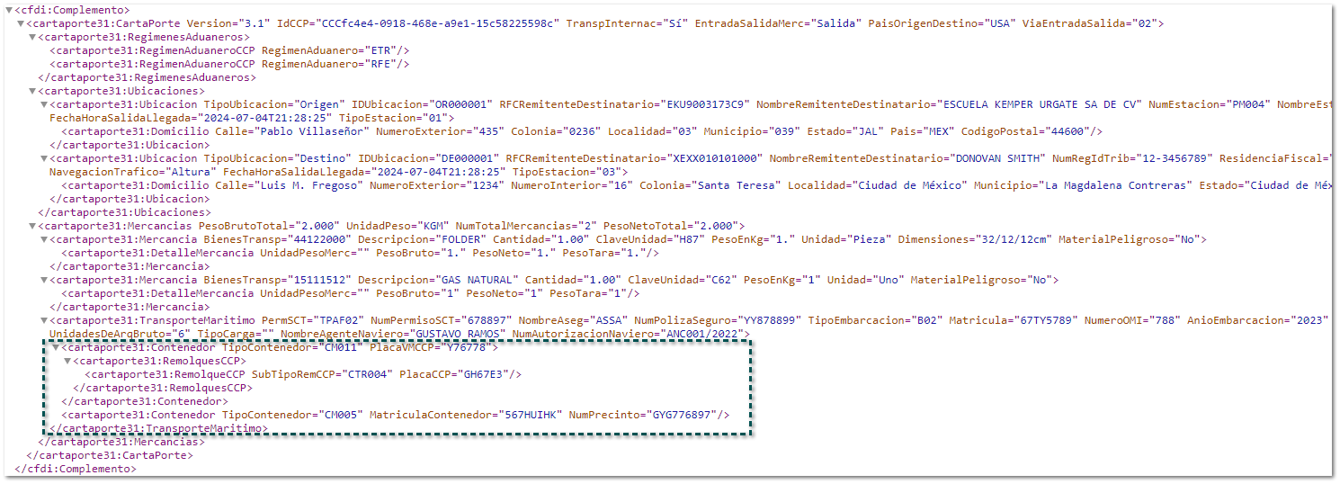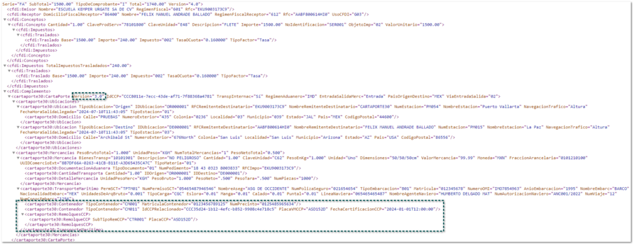 En la versión 3.0 del complemento Carta Porte el XML la captura de contenedores se muestra de la siguiente manera: