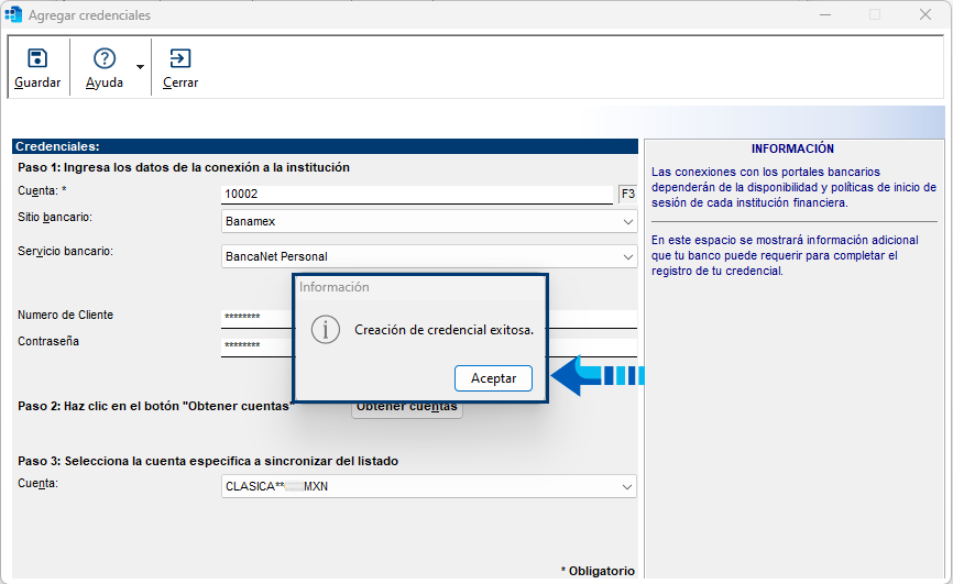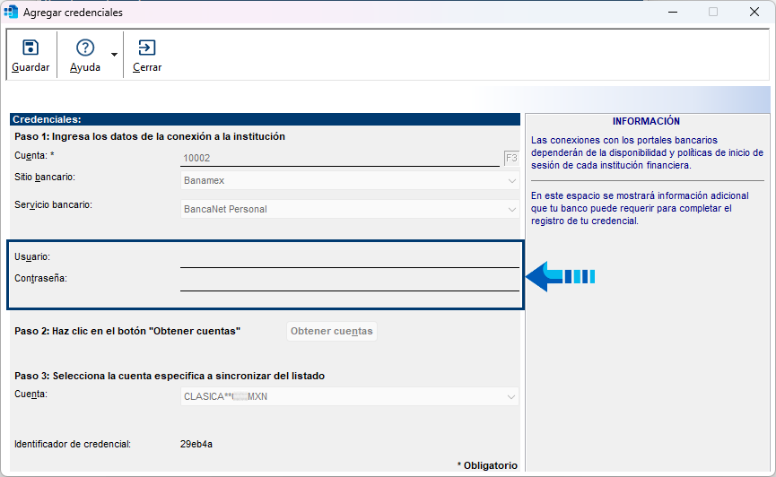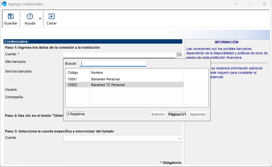 Ingresa los datos que se te piden en el paso 1 para la conexión a la institución bancaria. En el campo "Cuenta", se desplegarán las cuentas que tengas registradas en el catálogo de cuentas bancarias de CONTPAQi® Bancos, para que selecciones la que quieras configurar.