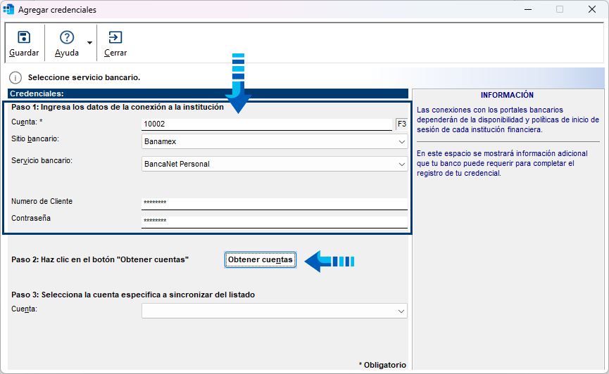 Selecciona el banco y servicio bancario que utilices y en este caso, captura el número de cliente y contraseña del portal bancario. Enseguida haz clic en el botón "Obtener cuentas”, y espera un momento para que se validen los datos y puedas avanzar al paso 3.