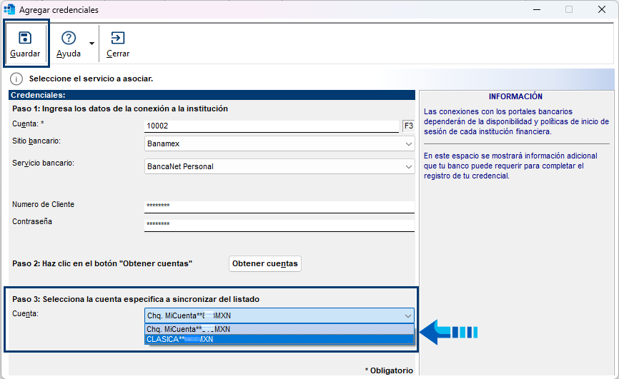 Una vez que se validan los datos, se habilitará la opción para que selecciones la cuenta  que deseas sincronizar de tu portal bancario, en caso de que tengas más de una cuenta con ese usuario o cliente bancario. Selecciona la cuenta deseada y presiona el botón "Guardar".