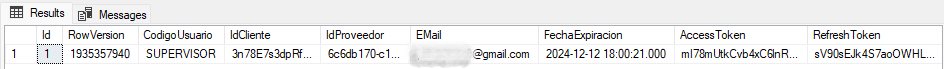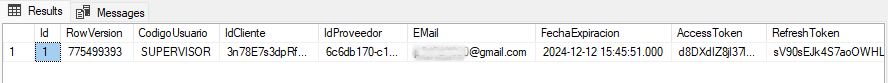 Aquí puedes ver el registro actualizado una vez que se volvió a presionar el botón "Autenticar"; el nuevo token se muestra ahora en el campo "AccesToken" y en el campo "FechaExpiración", se muestra la nueva hora del token (en este caso la fecha es la misma).