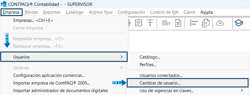 Desde el sistema CONTPAQi® Contabilidad o CONTPAQi® Bancos, dirígete al menú "Empresa", submenú "Usuarios" y haz clic en "Cambiar usuario".
