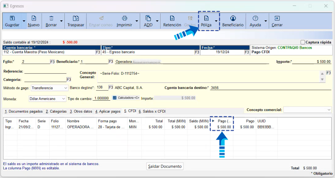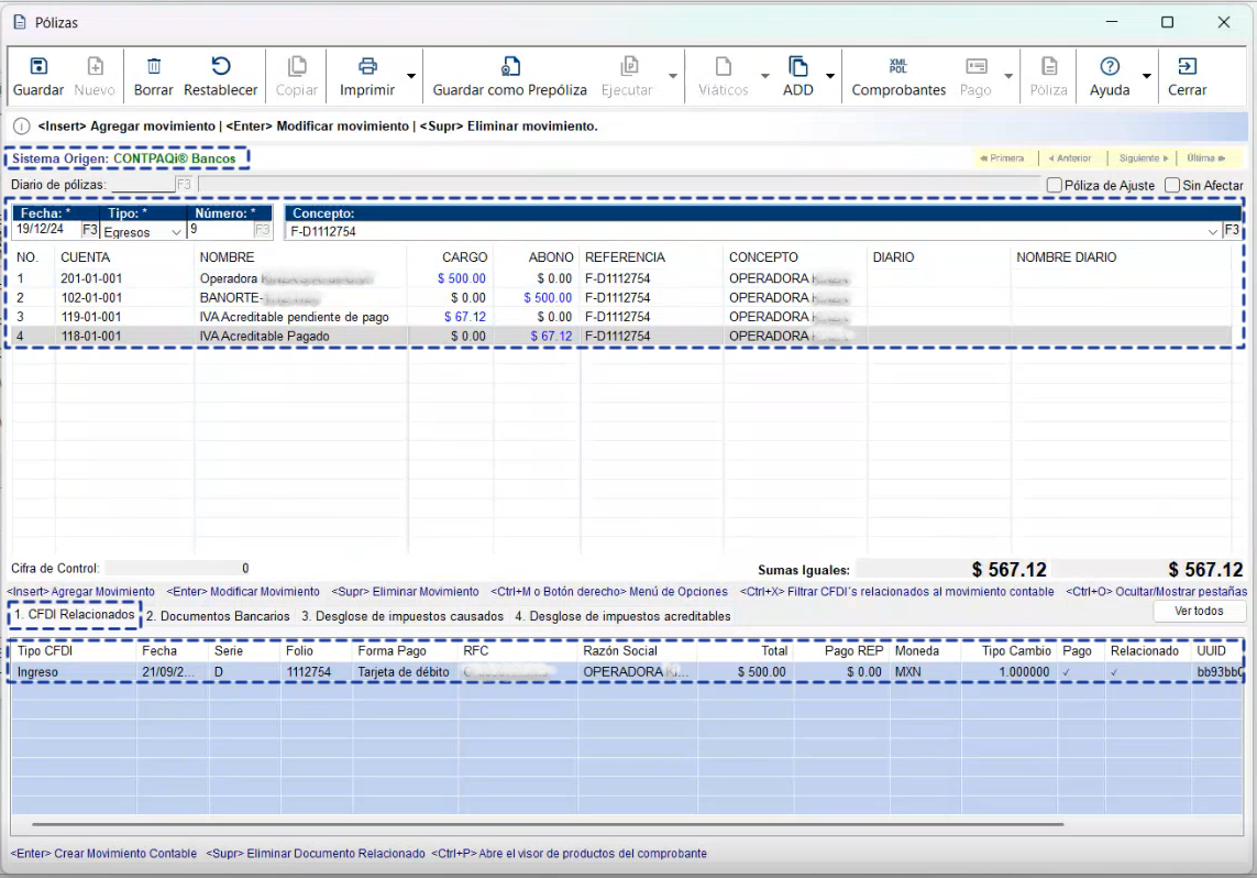 ![]() Una vez contabilizado el documento bancario, verás los movimientos contables y en la pestaña "1.CFDI Relacionados", se muestra el comprobante asociado, como lo vemos normalmente.