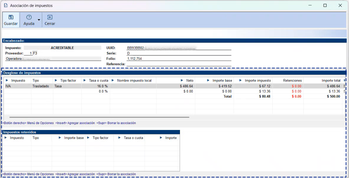 ![]() Podrás hacer doble clic sobre el registro de impuestos deseado y se abrirá la ventana "Asociación de impuestos" para que puedas ver todos los detalles. Los impuestos trasladados se despliegan en la sección "Desglose de impuestos" y los impuestos retenidos se mostrarán en la parte inferior de la ventana.