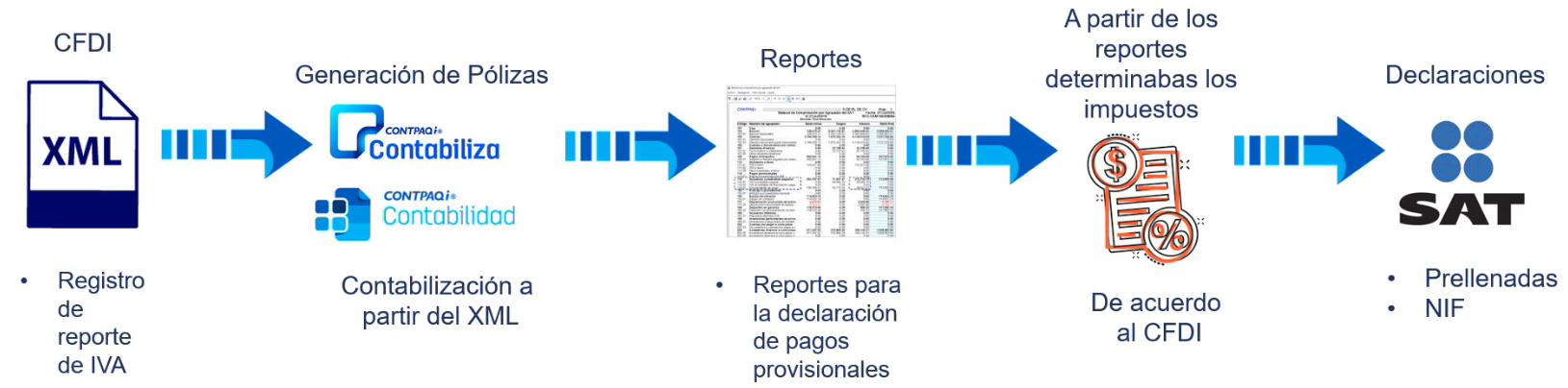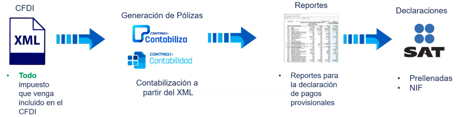 Ahora se consideran todos los impuestos contenidos en el CFDI (ya no es únicamente el IVA); al crear las pólizas y asociar sus CFDI correspondientes, realizamos el desglose de todos los impuestos existentes en los CFDI. Posteriormente generamos los reportes para la declaración de pagos provisionales y con base en ello, presentamos las declaraciones.