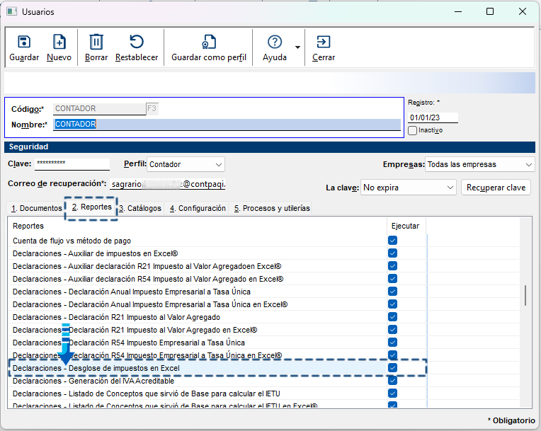 Podrás decidir qué usuarios tendrán el permiso para ejecutar el reporte desde el perfil y/o configuración del usuario.