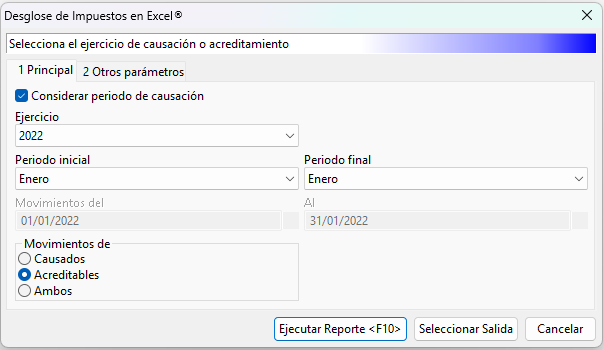 Cuando ingreses al reporte, se mostrará la ventana de filtros para que indiques el tipo de información que deseas consultar. Podrás seleccionar el ejercicio y rango de periodos que deseas consultar, movimientos causados, acreditables o ambos y si deseas considerar el periodo de causación o las fechas de los movimientos.