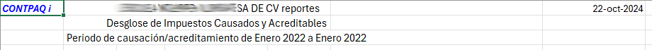En el encabezado del reporte se desplegará el nombre de la empresa en la que te encuentres y la fecha de ejecución del reporte. Dependiendo de los filtros que selecciones será el título del reporte. Si seleccionas sólo los movimientos Causados, el título del reporte será "Desglose de Impuestos Causados", y si seleccionas movimientos Acreditables, el título será "Desglose de Impuestos Acreditables". En la siguiente imagen se muestra un ejemplo del encabezado, en el que seleccionamos tanto los impuestos Causados como los Acreditables.
