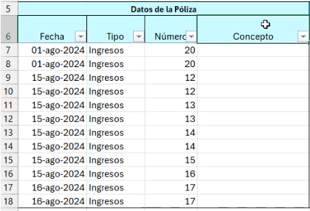 El reporte cuenta con tres secciones que corresponden a la información de la póliza, los CFDI relacionados y el desglose de impuestos. Las primeras columnas del reporte corresponden a los datos de la póliza: