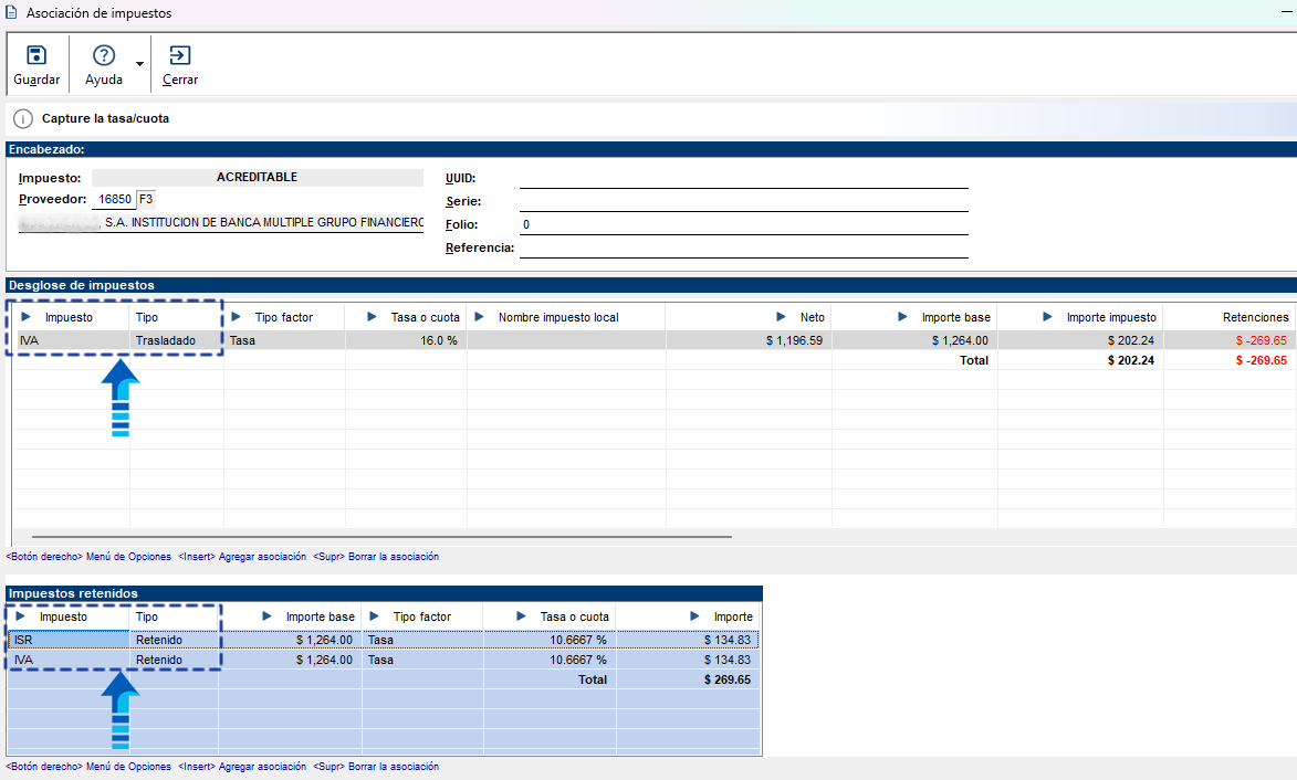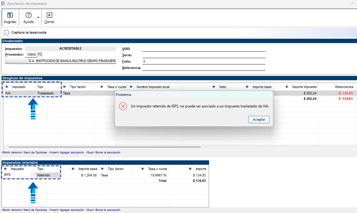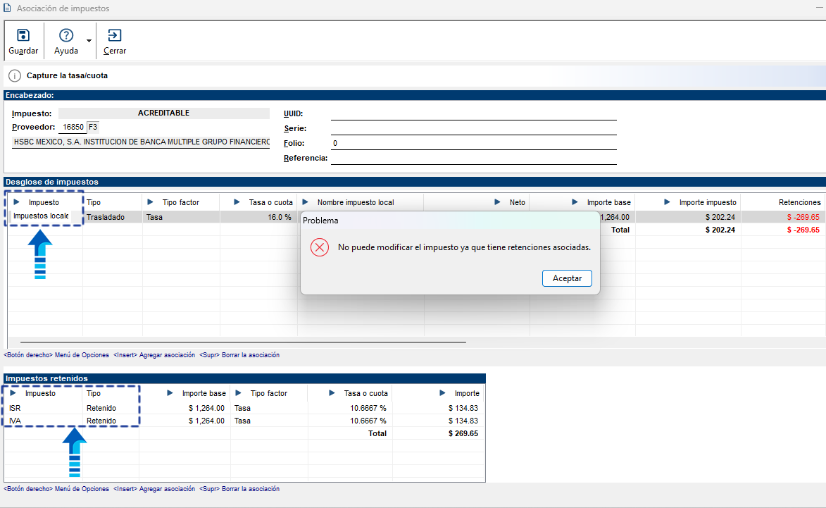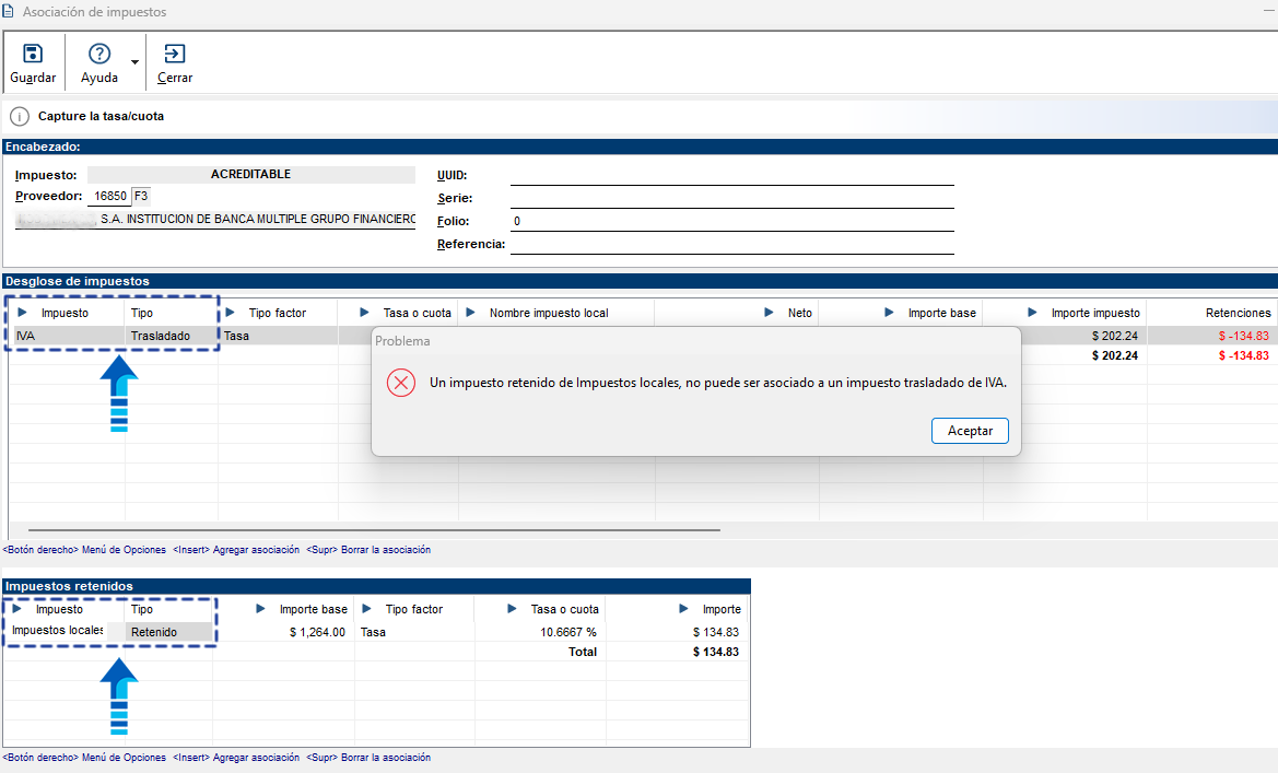 Un impuesto retenido de "Impuestos locales", no debe ser asociado a un impuesto trasladado de IVA.