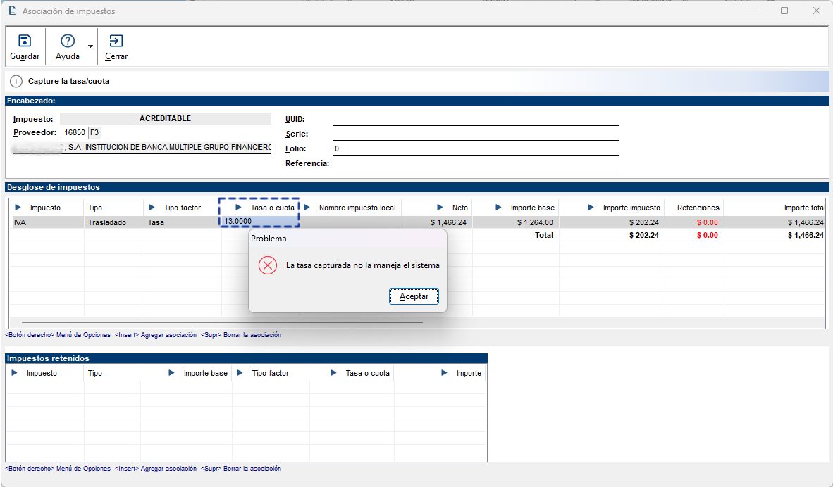 En caso de registrar una tasa de impuesto no existente o algún dato inválido, se envía un mensaje indicando dicha situación.