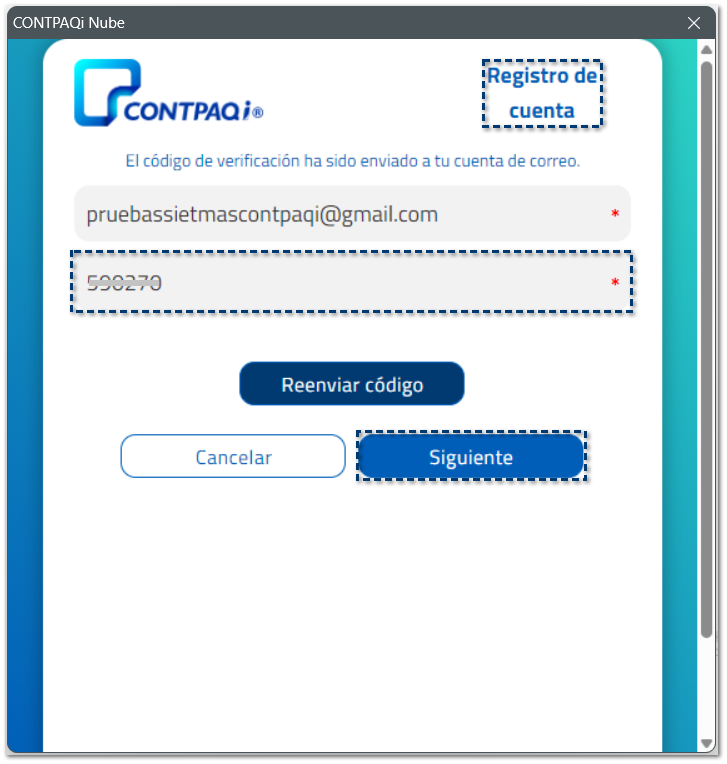 En el campo Código de verificación, captura el Código de confirmación que fue enviado a tu cuenta de correo electrónico.