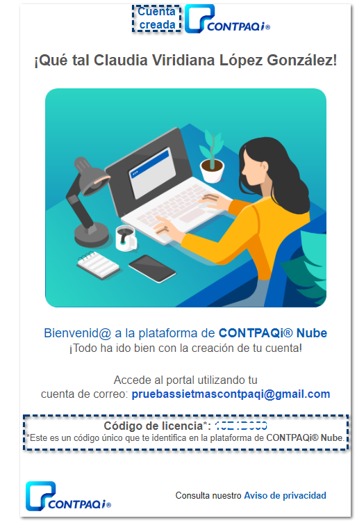 El Código de licencia se genera al registrarte y generar tu identidad. Aún cuando cambies el correo electrónico de tu cuenta, el código de licencia no cambia y se mantiene ligado a tu cuenta, además, con dicho código, podrás adquirir los sistemas CONTPAQi® Nube.