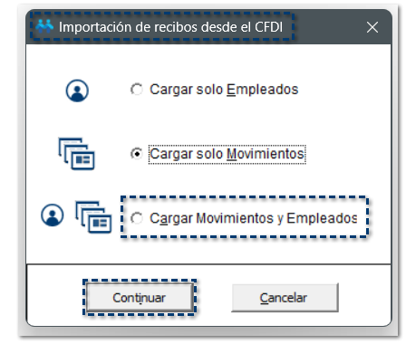 Si deseas crear los catálogos de la empresa, o en su defecto, el catálogo de Empleados y los sobre-recibos de tus empleados en un solo proceso, selecciona la opción Cargar Movimientos y Empleados y haz clic en Continuar.