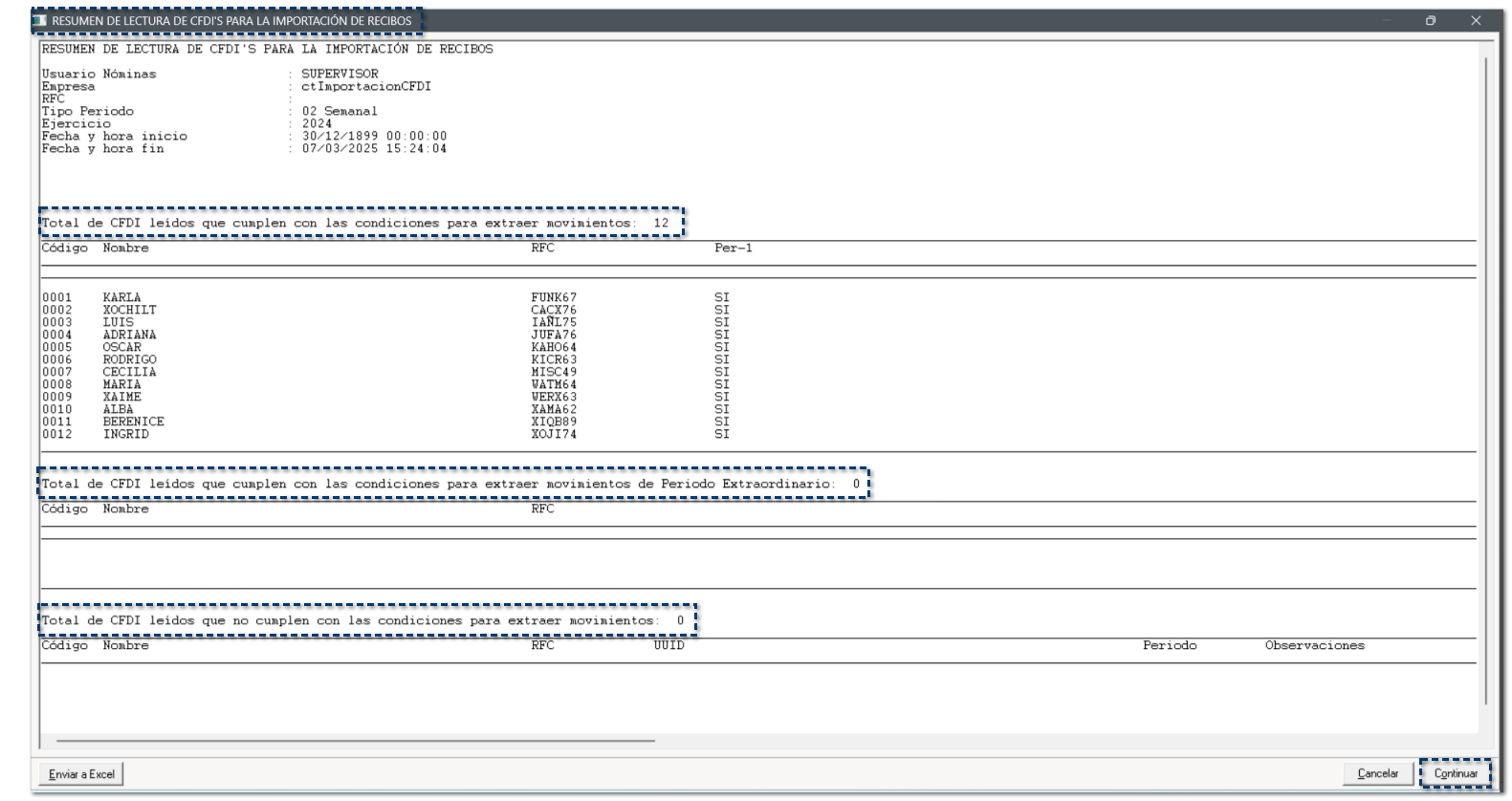 Una vez que has especificado la información necesaria para importar los CFDI de nómina, haz clic en el botón Continuar, para iniciar el proceso de importación: