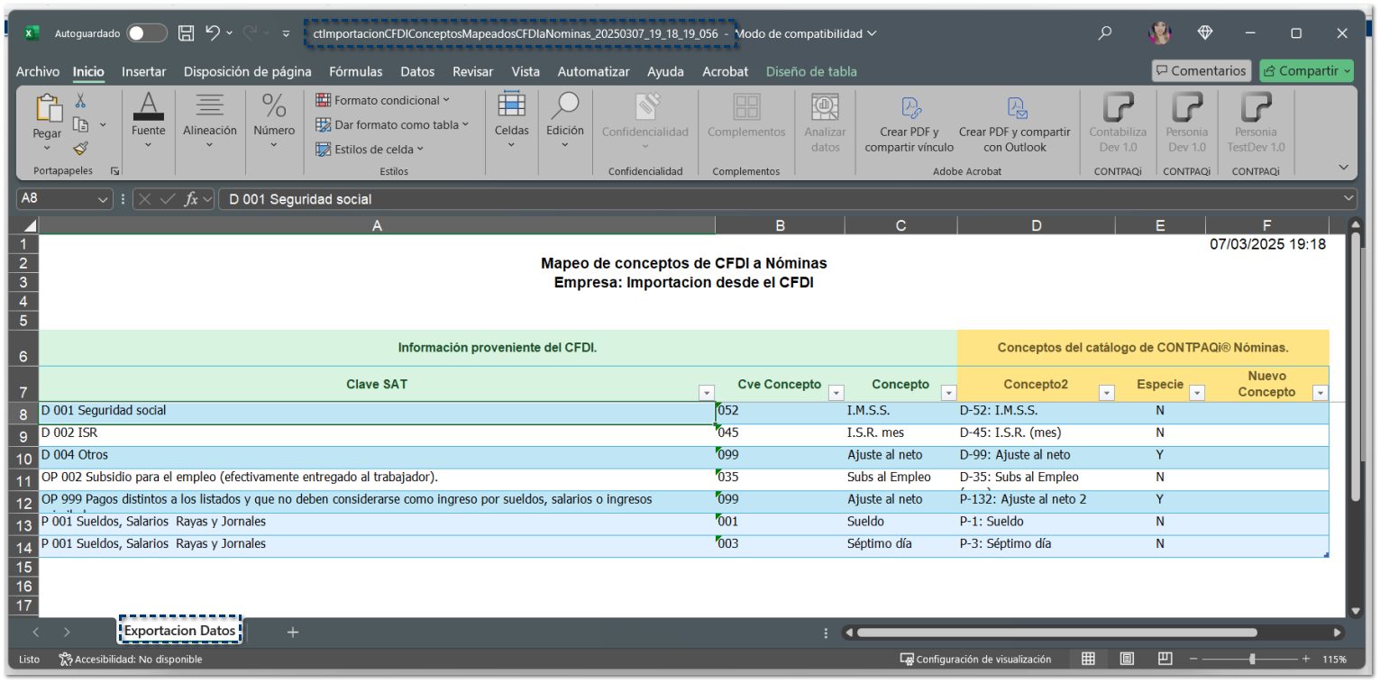 La relación se hace mediante la CLAVE SAT de los conceptos. Recuerda que encontrarás conceptos de tipo Percepción, Otros Pagos y Deducciones, con su correspondiente clave SAT.