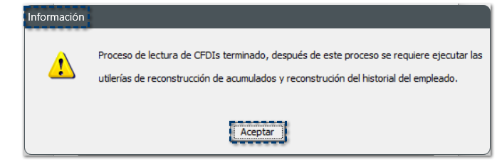 Al finalizar el proceso, se mostrará el siguiente mensaje que indica que el proceso de lectura de CFDIs ha terminado, por lo que, se requiere ejecutar las utilerías de reconstrucción de acumulados y reconstrucción del historial del empleado.