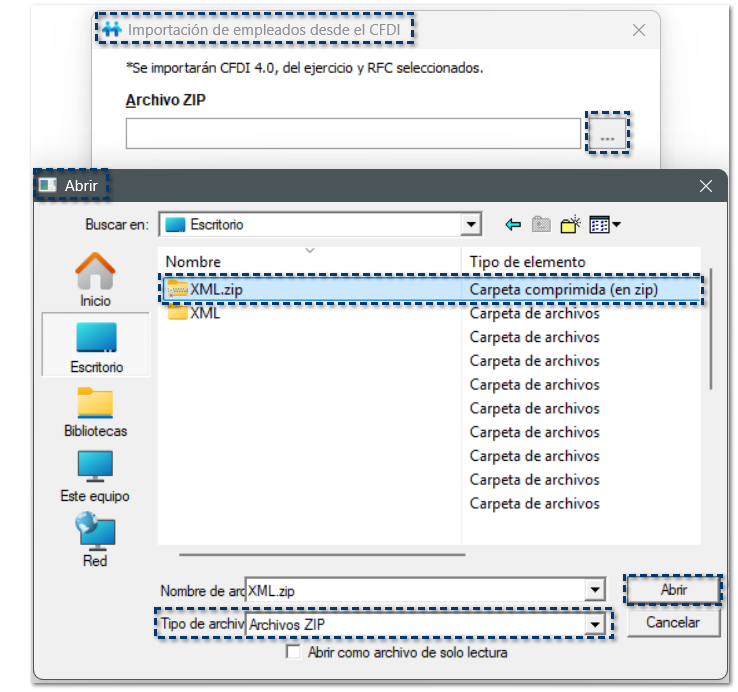 , se mostrará el Explorador de Windows®, deberás indicar la ubicación donde se encuentra la carpeta con formato .ZIP y seleccionarla: