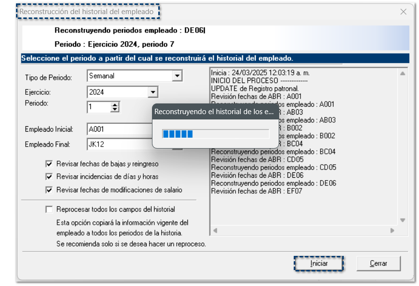 Visualizarás la ventana Reconstrucción del historial del empleado, donde deberás especificar los parámetros de ejecución para esta utilería.