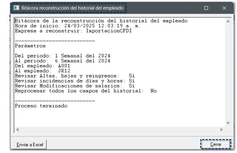 Al finalizar la reconstrucción del historial de empleados, haz clic en Aceptar, para consultar la bitácora del proceso.